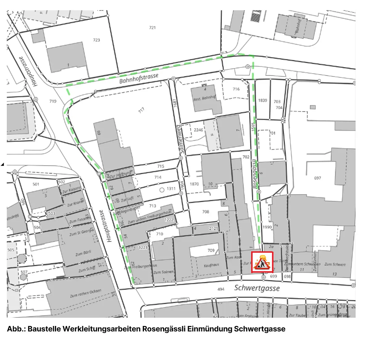 Betroffen ist lediglich der Bereich der Einmündung Schwertgasse. Das Rosengässli ist von der Bahnhofstrasse weiterhin ohne Einschränkung zugänglich. Die Fussgänger werden über die Bahnhofstrasse – Hauptstrasse umgeleitet. Vielen Dank für Ihr Verständnis.
