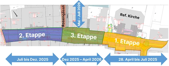 Bei Wiederaufnahme der Arbeiten im neuen Jahr, voraussichtlich am Montag, 12. Januar 2026, werden im Bereich der 2. Etappe Parkmöglichkeiten eingerichtet und die Strasse wird für Besucher und Zubringer der Schwertgasse als Sackgasse geöffnet.