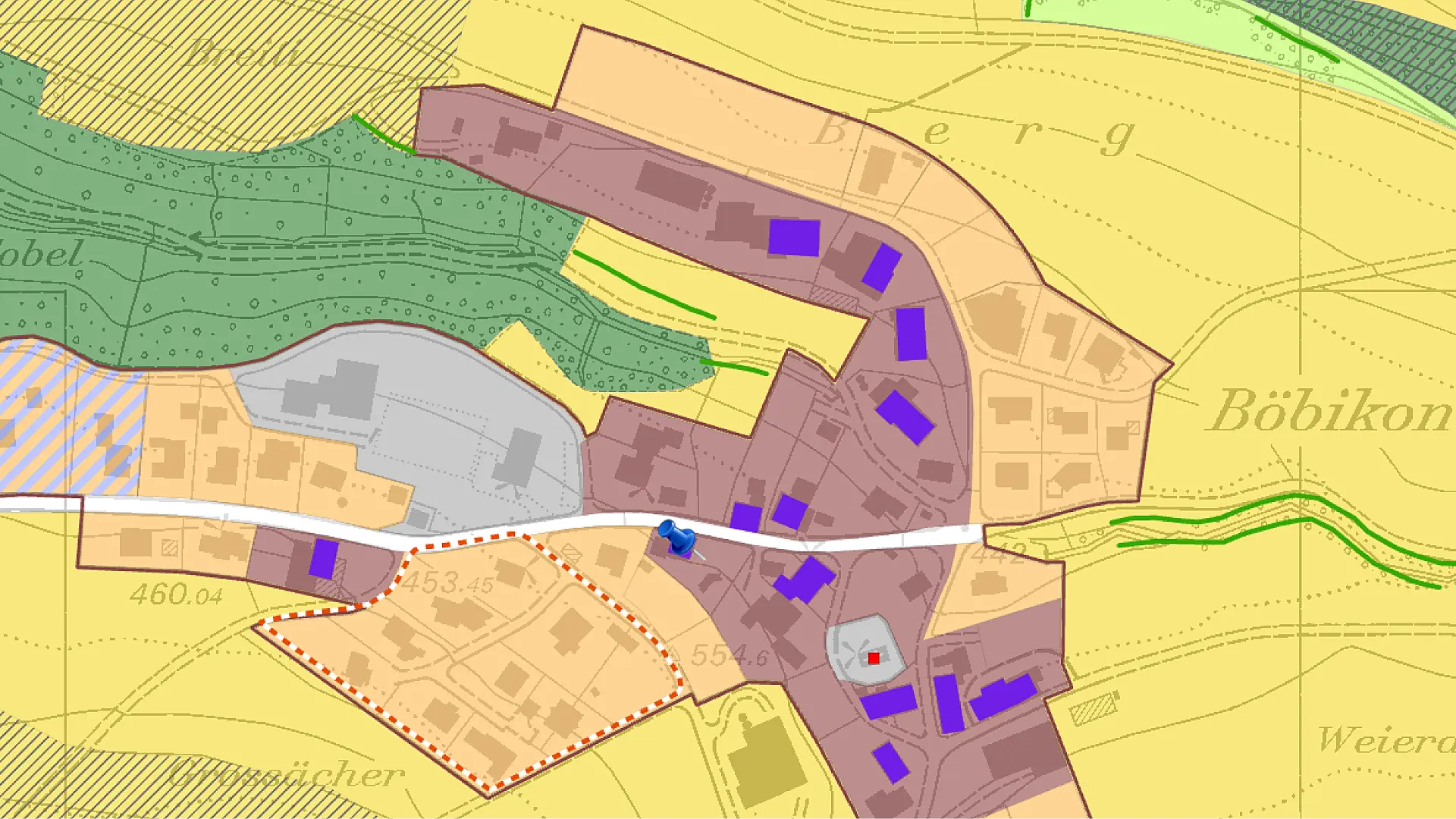 - Dichte und Ausnutzung ca. 20-40 E/ha, einzelne dichter oder weniger dicht bebaute Gebiete. Generell tiefere Dichtewerte als vom kantonalen Richtplan gefordert. An verschiedenen Orten periphere Bauzonenreserven.