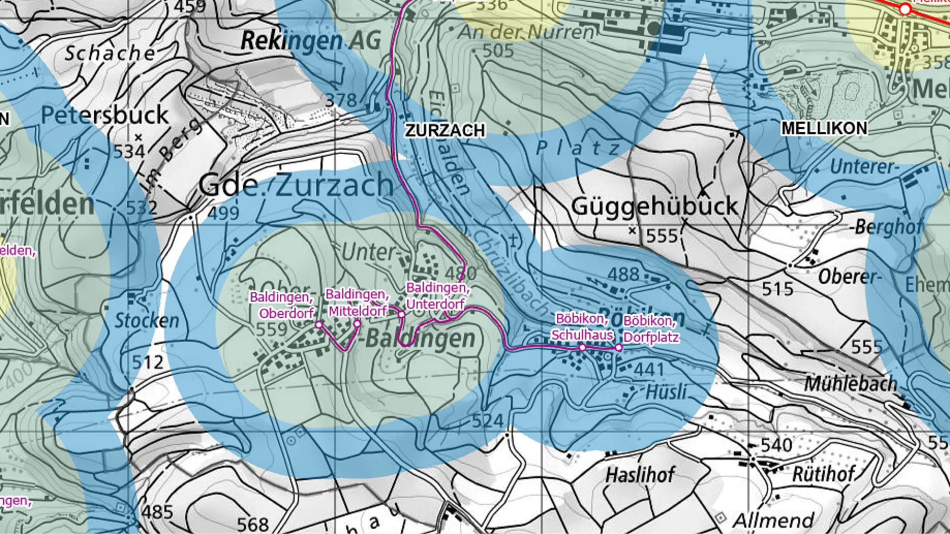 Baldingen und Böbikon mit schlechter ÖV-Anbindung (E/F), Wislikofen und
